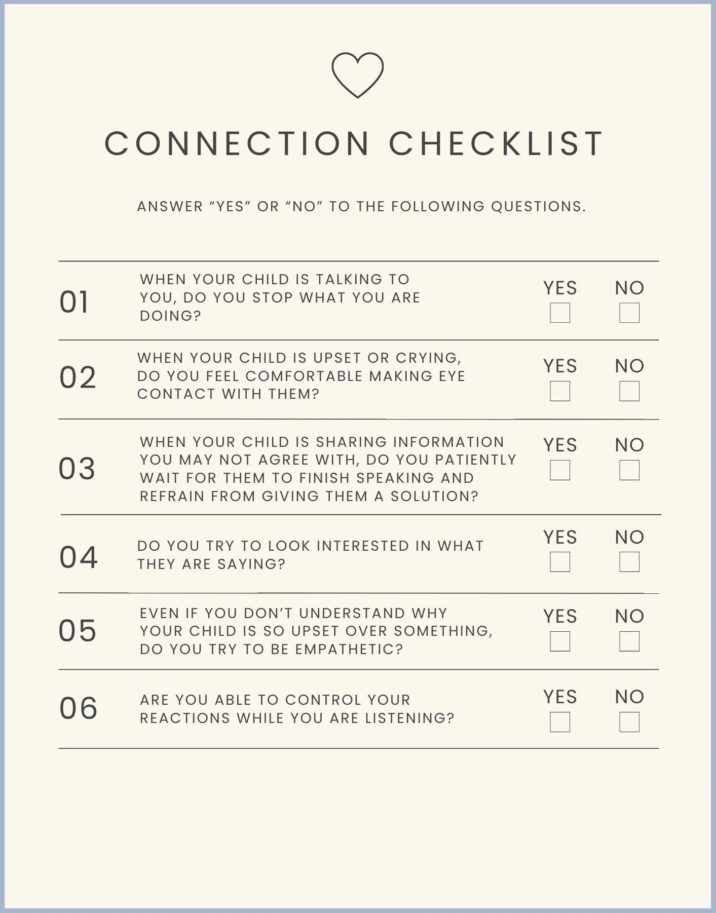 I created this checklist to help you gage what areas you may need a little help in to connect better with your child.
